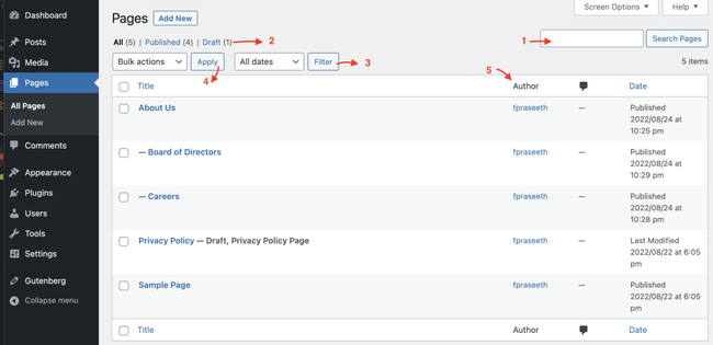 In the left menu you can find the All Pages link.