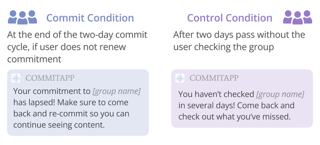 Both conditions used the same custom group chat app that we developed, but the control groups interacted with a version that disabled the commitment mechanism. Their in-chat banner was a reminder of how long it has been since they last posted. They received notifications at the same rate as the Commit groups. Instead of notifications around commitment, participants in the control condition received notifications reflecting best practices in encouraging participation, like nudging, reminding people of intrinsic benefits, and requesting specific desired actions (Ren et al., 2012). We show an example of paired notifications in Figure 4; full notification text is in Appendix A.1.