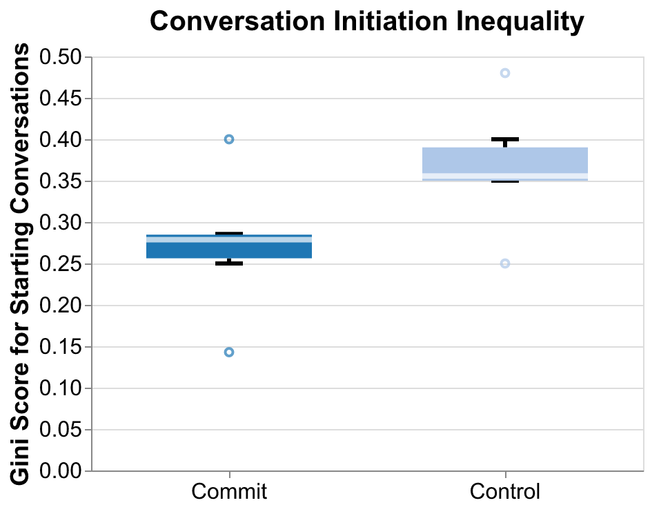 This equality result helps to disentangle the myriad impacts of Commit. While the majority of Commit condition participants described motivation coming from both the mechanism itself and the activity of their group members, those two effects are difficult to separate. However, from our data suggesting increased equality of conversation-starting, we have quantitative evidence of the more “direct effect” in that a greater share of Commit group participants were taking solo initiative.