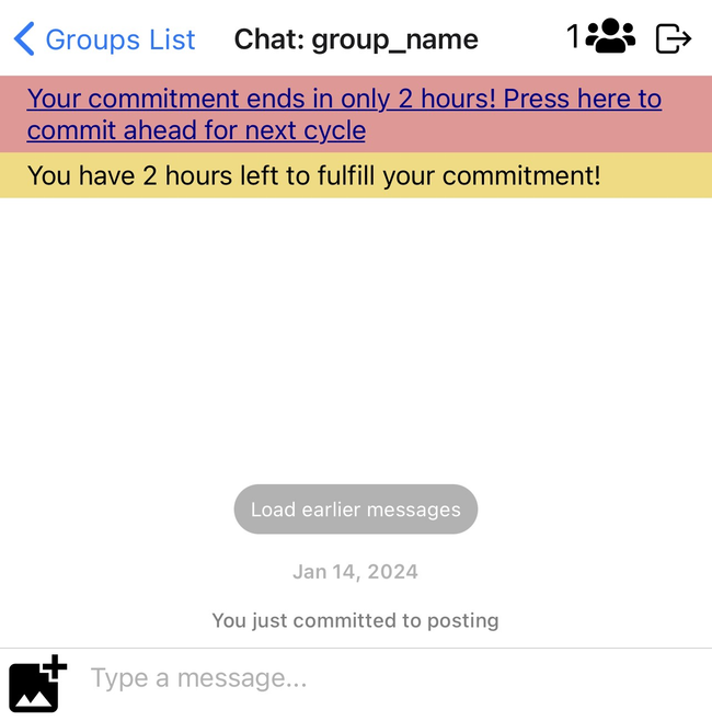 We instantiate this design in a mobile group chat platform called Commit. Group chats are a popular mechanism for online groups (Haigney, 2024), and Commit’s design mirrors common group messaging platforms such as WhatsApp or WeChat with a few differences to incorporate the mechanism of commitment. First, the group’s discussion is not visible until a member makes a commitment to participate in the group. Each member’s commitment, made visible in the group’s main feed, lasts by default a few days in exchange for the promise to contribute. Banners and notifications remind the user to fulfill their commitment or recommit for the next cycle when the period is ending and they have not done so. The application does not force participants to fulfill their commitment, nor does it broadcast whether they have done so: we rely on social (dis)approbation as more effective than technical consequences, especially since many groups can survive a little bit of free-riding.