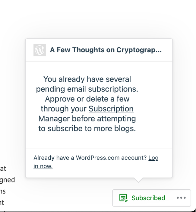 If you subscribe to too many sites without confirming you get this message: