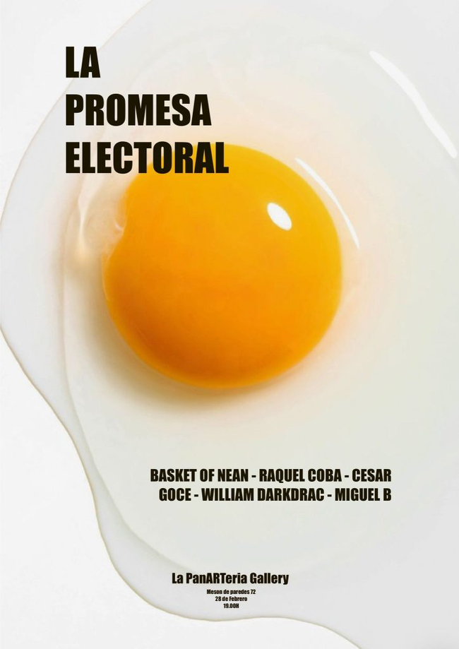 Hasta el 5 de abril podrá verse en La Panartería (Mesón de Paredes, 72) la muestra que se inaugura este viernes, ‘La promesa electoral’, y que reúne trabajos de cinco artistas habituales de esta galería de arte urbano: Basket of Nean, César Goce, William Darc, Raquel Coba y Miguel B.