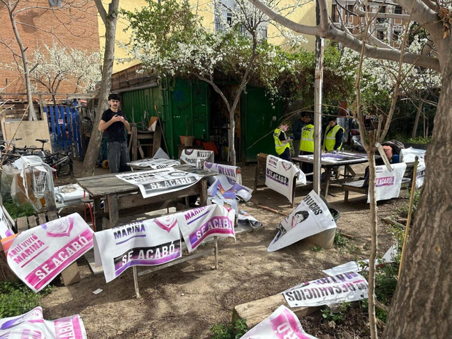 Complementando la acción del viernes, se han producido y repartido más de 100 lonas que cuelgan ya de otros tantos balcones y espacios de la zona. En ellas se lee el siguiente mensaje junto al rostro de Marina López: «Los desahucios matan. Aquí vivió Marina. Se acabó«.