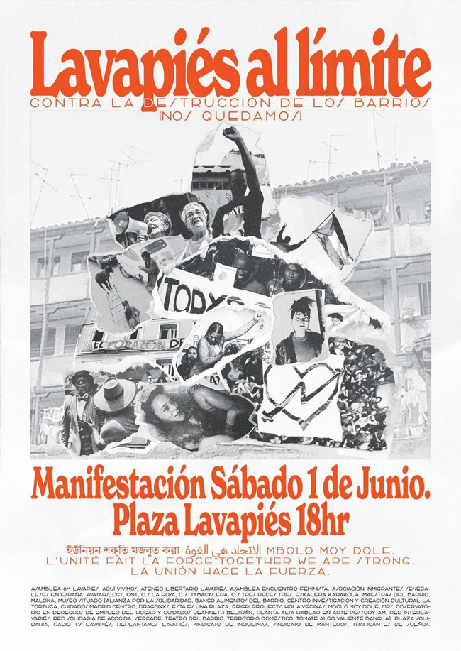 Pedimos a las instituciones que respeten los espacios de gestión participativa y organización ciudadana que ya están en funcionamiento y que son fundamentales para la vida en el barrio, como es el caso del centro social La Tabacalera o La Rosa. Igualmente exigimos asegurar el acceso a la salud de todas las personas con independencia de su estado administrativo, entendiendo ésta de forma integral, incluida la alimentación y la vivienda. Hay que atender a las barreras del idioma, disponiendo de intérpretes mediadores en distintas lenguas en el centro de salud y otras dependencias públicas en las lenguas mayoritarias del barrio: dariya, wolof, árabe y bengalí. Exigimos aulas de enlace (deficitarias en los colegios del barrio) para garantizar la integración de las niñas y niños procedentes de otros países. El refuerzo con más personal docente para reducir la ratio, también la mejora de instalaciones deportivas, el refuerzo de los programas de huertos escolares y educación medioambiental, la peatonalización de las zonas aledañas a los colegios e institutos. También medidas de apoyo integral a la juventud del barrio, para que su desesperanza deje de ser caldo de cultivo de bandas juveniles y desafección existencial. Hay que promover la regularización de personas migrantes, facilitando el empadronamiento, crear un fondo de emergencia habitacional para personas sin hogar, intermediar en procesos de desahucio, ilegalizar los pisos de alquiler turístico y sancionar a los grandes tenedores. Que cese el estado policial en el barrio y que se fomenten lugares de encuentro interculturales. Queremos plazas vivas y seguras para todas las edades, con bancos y zonas ajardinadas, con más espacios para practicar deporte. Queremos en definitiva un verdadero barrio comunitario y transfeminista, que tenga en cuenta a la vecindad de todas las edades y procedencias. Estamos al límite y nos hemos juntado para conquistar nuestros deseos aquí y ahora, porque juntas somos más fuertes. Colectivos que firman el manifiesto: Asamblea 8M Lavapiés, Aquí Vivimos, Ateneo Libertario Lavapiés, Asamblea Encuentro Feminista, Asociación Inmigrantes Senegaleses en España, Avatars, CGT, C.S La Rosa, C.S. Tabacalera, C.S 3Peces3, Eskalera Karakola, Maestras del Barrio, Maloka, Museo Situado, Alianza por la Solidaridad, Banco Alimentos del Barrio, Centro Investigación y Creación Cultural La Tortuga, Cuidados Madrid Centro, Dragonxs de Lavapiés, Esta es una Plaza, Grigri Projects, Hola Vecinas, Mbolo Moy Dole, MRS, Observatorio en Derechos de Empleo del Hogar y Cuidados Jeanneth Beltrán, Planta Alta, Hablar en Arte Postory AM, Red Interlavapiés, Red Solidaria de Acogida, Sercade, Teatro del Barrio, Territorio Doméstico, Tómate algo, Valiente Bangla, Plaza Solidaria, Radio TV Lavapiés, Replantamos Lavapiés, Sindicato de Inquilinas, Sindicato de Manteros, Traficantes de Sueños.