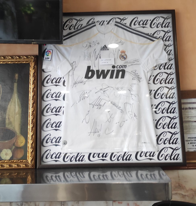 Además de mobiliario y de objetos propios de un local de hostelería, es curioso ver cómo en La Carpa están a la venta desde el conjunto de cuadros que tenía el bar como decoración hasta una camiseta del Real Madrid firmada por antiguos jugadores.