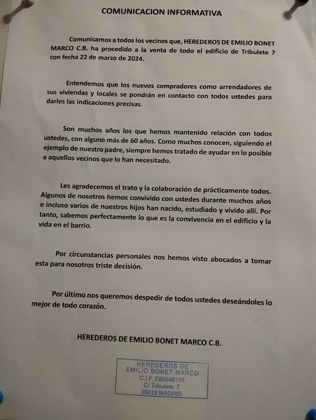 Hoy, a través de sus redes sociales, los habitantes de Tribulete 7 han dado a conocer la venta del edificio haciendo pública la «emotiva circular» con la que sus antiguos caseros les han comunicado la nueva situación.