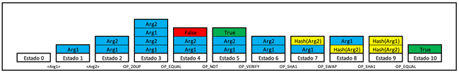 Con OP_EQUALVERIFYse comprueba que los dos elementos de arriba de la pila son iguales. Si lo son, OP_EQUAL devuelve True y OP_VERIFY comprueba que efectivamente es True, eliminándolo y permitiendo que continúe la ejecución.