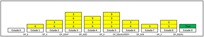 Primero se añade el 2 (OP_2) a la pila, el cual era el operador aportado por el Unlocking Script. Acto seguido se añade de nuevo 2 (OP_2) y se suman ambos valores de la pila (OP_ADD). Después se añade 4 (OP_4) y finalmente se comparan si los dos elementos de arriba de la pila son iguales (OP_EQUAL). De ser así, este operador eliminará esos dos elementos superiores de la pila y añadirá "True" al stack, confirmando que la validación del script ha sido exitosa.