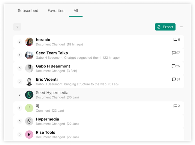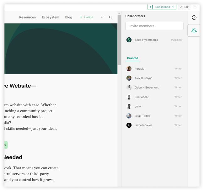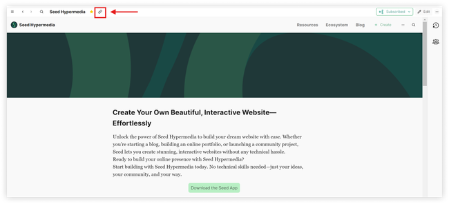 When you start using Seed, you can easily share your documents with peers and others by copying the document or site link. This button will be located on the top bar at the right side of the app breadcrumbs.