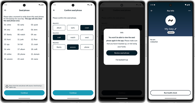 Acto seguido Nunchuk nos hará un test para ver si la hemos apuntado bien. Lo completamos y Continue