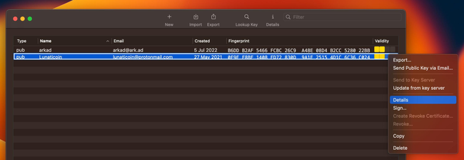 Después de verificar en otros medios que pertenece a Craig Raw, hago click sobre el botón derecho y voy a details > ownertrusted > ultimate. De esta manera marco la clave como confiable (aparece en verde).
