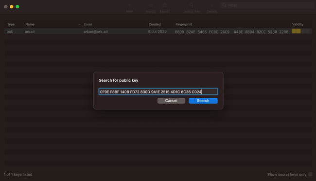 Lookup key: Nos permite buscar una clave pública con el fingerprint o email del usuario que buscamos.