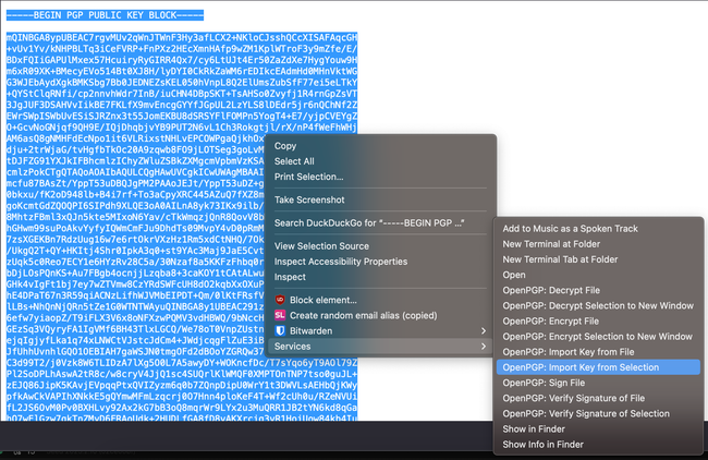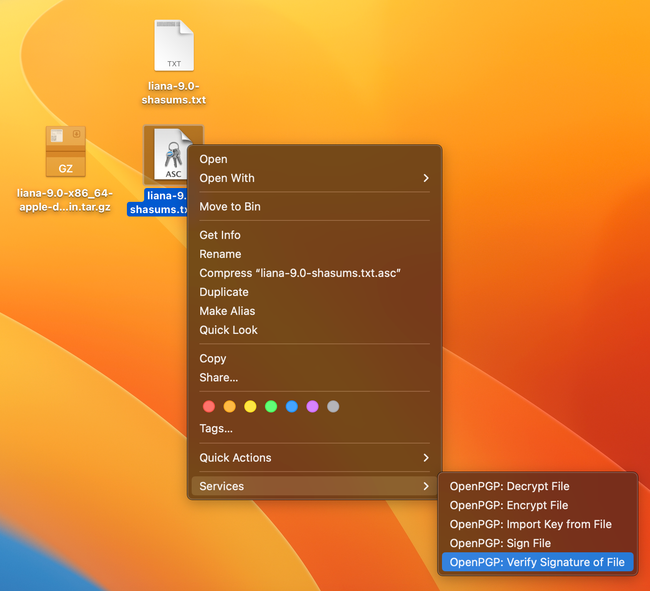 Hacemos click con el botón derecho sobre el archivo que termina en txt.asc y vamos a Services > OpenPGP: Verify signature of file.