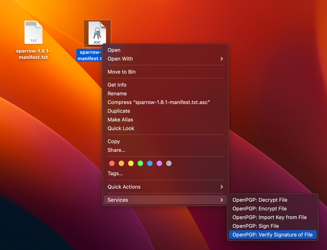 Como hicimos antes con Sparrow wallet verificamos el software que vamos a instalar haciendo click con el botón derecho sobre el archivo .asc y...