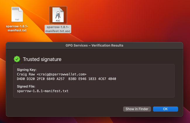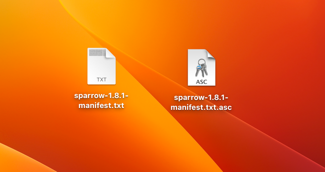 Anteriormente descargamos tres archivos: sparrow-2.1.3-manifest.txt (el hash del ejecutable), sparrow-2.1.3-manifest.txt.asc (la firma del hash del ejecutable realizada por Craig Raw) y el ejecutable (*.dmg). Para verificar es necesario que los dos primeros archivos mencionados estén en la misma carpeta.