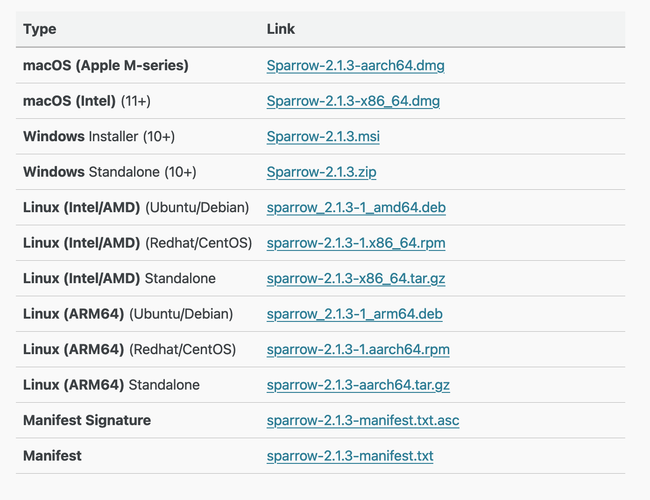 CertUtil -hashfile Sparrow-2.1.3.msi SHA256 (según la última versión)
