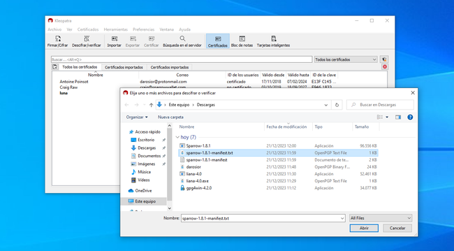 Para ello le damos a "Descifrar/Verificar" en Kleopatra y localizamos el archivo "sparrow-2.1.3-manifest.txt.asc" y lo abrimos.