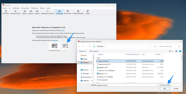 Ahora vamos a importar la clave de Edouard Paris en un nuestro llavero PGP. Para ello abriremos Kleopatra y le daremos al botón superior derecho de "Certificados". Buscamos la carpeta *"Descargas" *donde habíamos guardado el archivo de la clave pública de Edouard, y lo añadimos dándole a abrir. Si no ves ele archivo selecciona ver "todos los archivos".