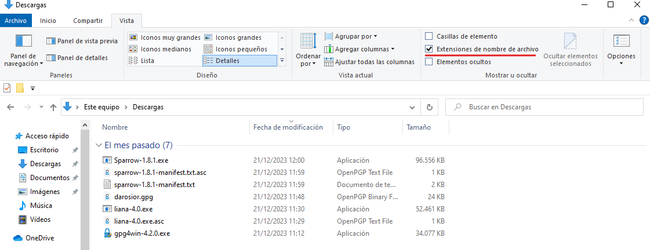 Hemos descargado 3 archivos, uno será el ejecutable .exe, otro terminado en .txt, el cual guarda la lista de hashes sha256 sobre los diferentes ejecutables. Y el otro es .asc, que es el archivo con la firma que ha hecho el desarrollador sobre el archivo .txt que contiene los hashes.