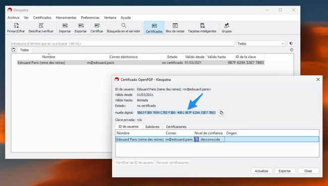 Entonces y de forma gráfica veremos como en pantalla se nos muestra que tenemos la clave pública de Edouard añadida. Y además, en la parte de la derecha podremos ver el el Long ID de su clave PGP.