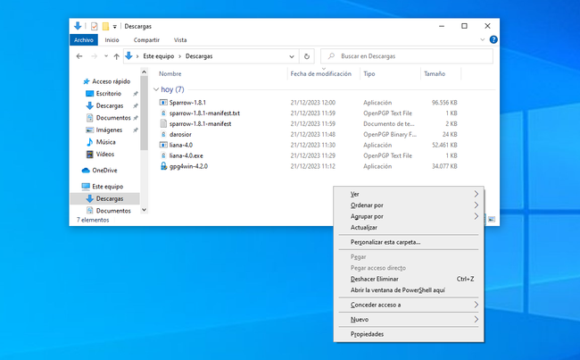 Para ello abriremos la carpeta donde tenemos los documentos y manteniendo SHIFT apretado haremos botón derecho sobre el espacio en blanco debajo de los archivos y le daremos a "Abrir la ventana de PowerShell aquí":