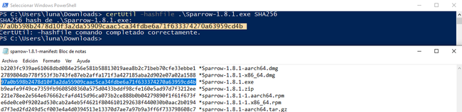 Si concuerda, felicidades. Has verificado que el ejecutable tiene un hash que aparecía en un archivo de texto firmado por el desarrollador oficial. Ya puedes darle doble click al ".msi" e instalar Sparrow.