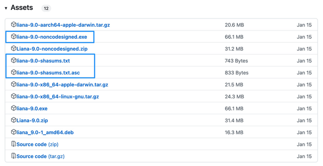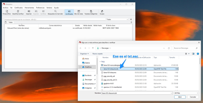 Una vez incluida la clave de PGP de Edouard, vas a verificar el software de Liana. Como vimos antes, habíamos descargado 3 archivos, uno será el ejecutable .exe, otro terminado en .txt, el cual guarda la lista de hashes sha256 sobre los diferentes ejecutables. Y el otro es .asc, que es el archivo con la firma que ha hecho el desarrollador sobre el archivo .txt que contiene los hashes.