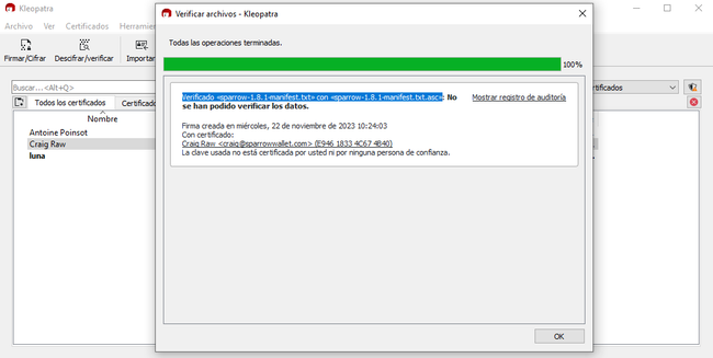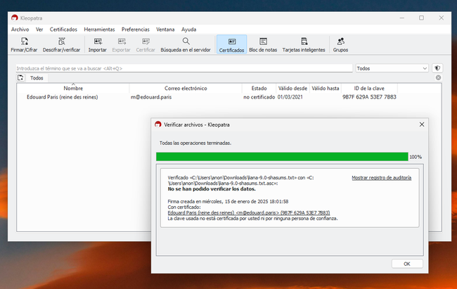 Cuando selecciones el archivo, Kleopatra verificará si la firma hecha sobre el ejecutable está hecha con una clave pública que tengas en tu llavero (de momento solo tenemos la de Edouard).