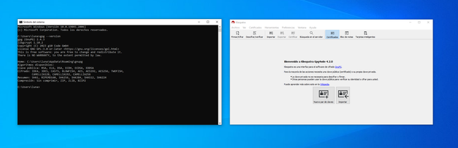 Cuando lo hayamos hecho, a parte de tener la interfaz de Kleopatra accesible podremos comprobar en la línea de comando cómo sí que ahora se ha instalado GPG en Windows: