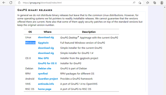 Allí haremos scroll hasta la sección de GnuPG Binary Releases y buscaremos en la segunda línea "Windos GnuPG" y haremos clic para descargarlo e instalarlo.