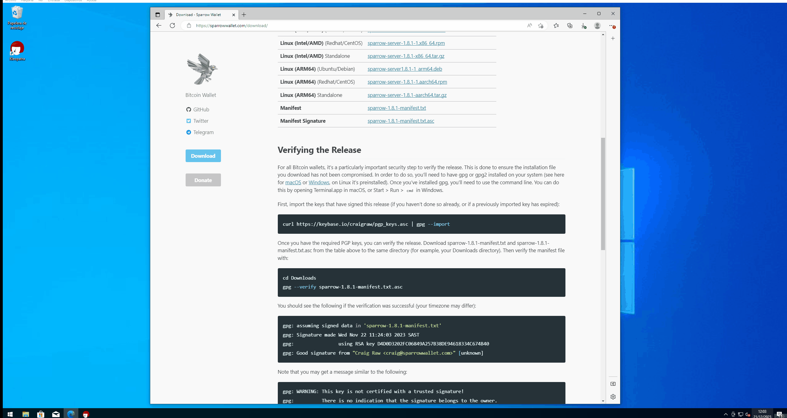 Ahora vamos a verificar la firma "sparrow-2.1.3-manifest.txt.asc" (actual) que hemos decargado y que se ha realizado sobre un archivo de texto con los hashes.