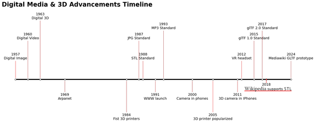 Technical Progress: A functional prototype for glTF support [12] has been developed in collaboration between volunteers and WMF employees, and over 100,000 freely licensed 3D models, downloaded from Sketchfab, are ready to be incorporated into Commons. A curated list of sources for freely licensed 3D assets, including public institutions, open-source communities, private organizations, etc. is being developed.
