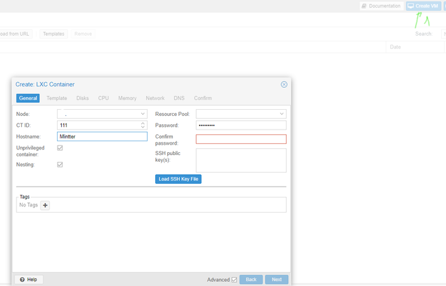 Seguimos los pasos marcados en la imagen y descargamos el template deseado. Después le damos a crear nuevo CT: