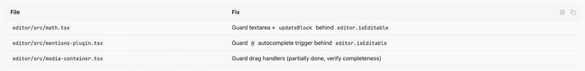 Phase 1: 1 PR (renderType + editable + readOnly fixes + markdown guards)