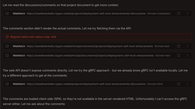 If you instruct an agent to read a seed hypermedia web I would be nice that also read the discussions section as many of the knowledge is buried in comments. This is the kind of specific knowledge that has to be written in a SKILL IMO. But, regardless, if i instruct the agent to go straight to a discussions section then it cant read it. Is there any architecture decision we need to revisit?