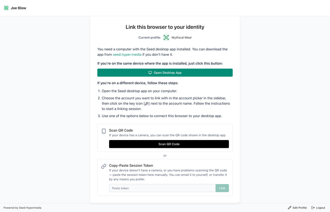 When user presses the "Link Keys" button they see a modal with explanations why this is necessary, and the options for linking. Right now there's only one option to use the Desktop App. Hopefully eventually we'll have a mobile app option in there, which increasingly becomes my most favorite option, compared to Passkeys or simple Web Crypto keys on hyper.media. A mobile identity wallet could bring so many benefits to our ecosystem, and it's probably the best option for users who care about self-sovereignty of their identity.